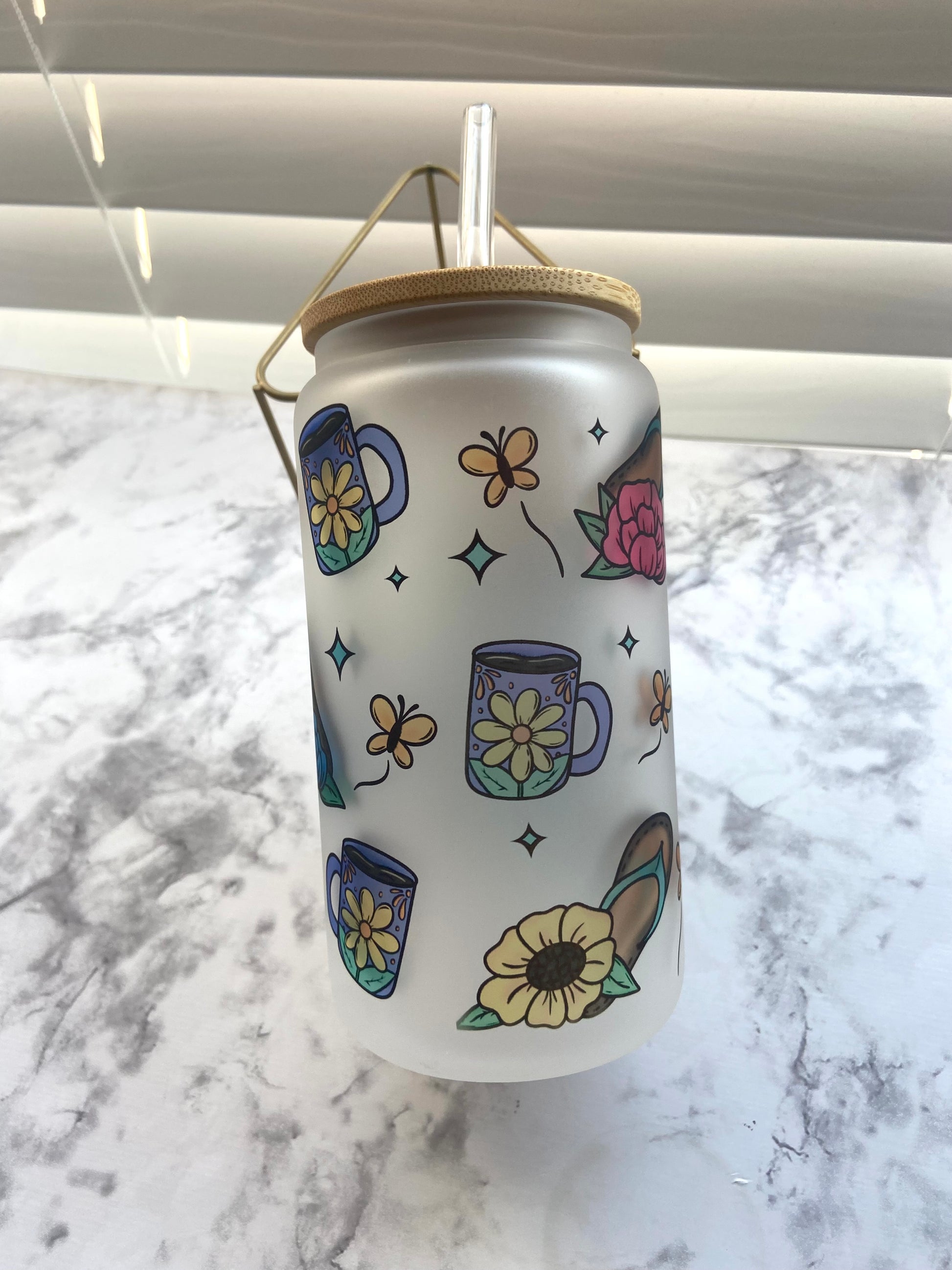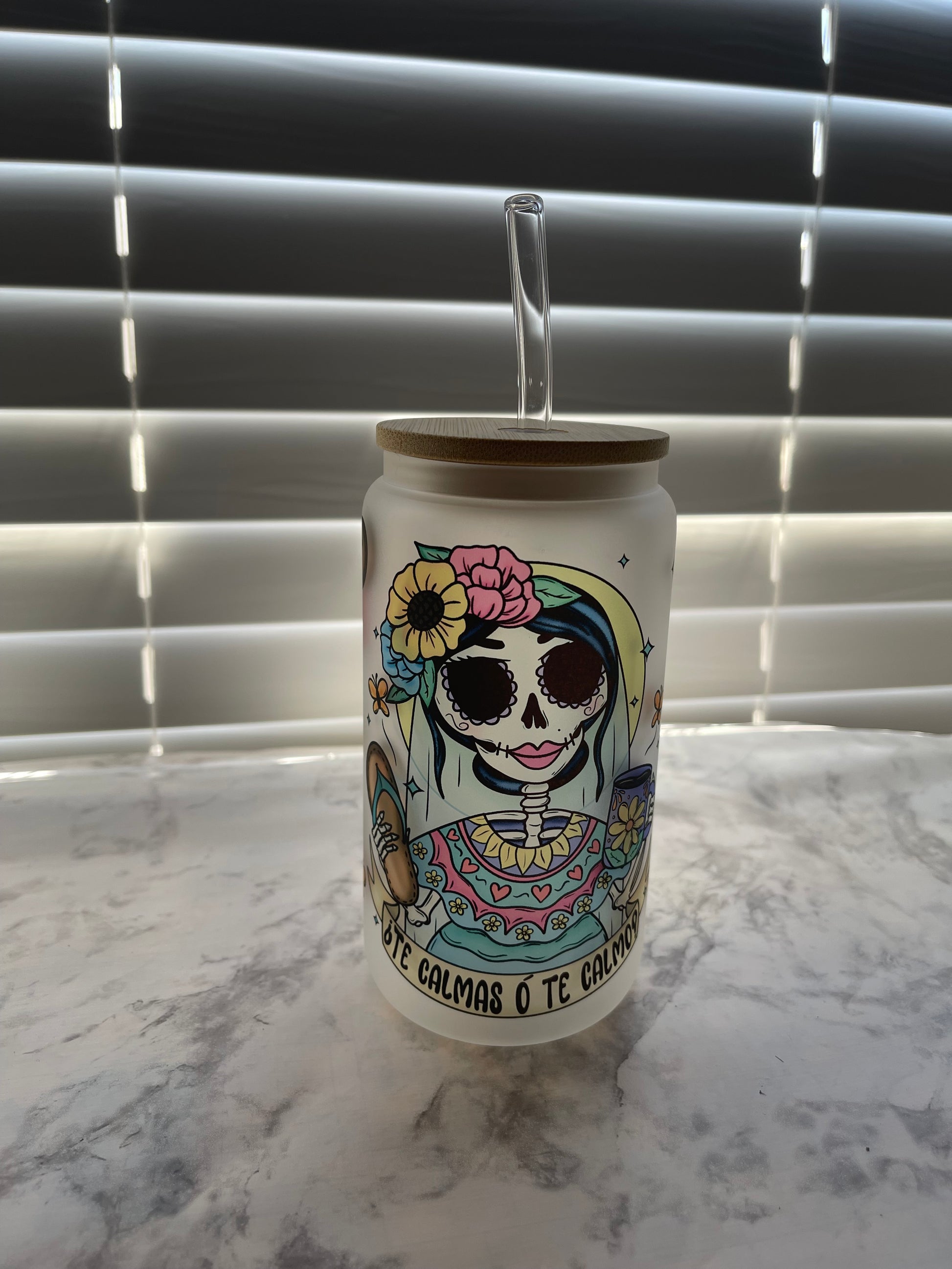 Embrace the vibrant and artistic design of the sublimated “o te calmas o te calmo” calavera on this 16 oz glass can. Care for your can by gently hand washing it with soap and warm water, avoiding the microwave and dishwasher. Remember to dry the bamboo lid immediately after washing and store it separately from the cup. Let the lid fully dry before storing for optimal preservation!"