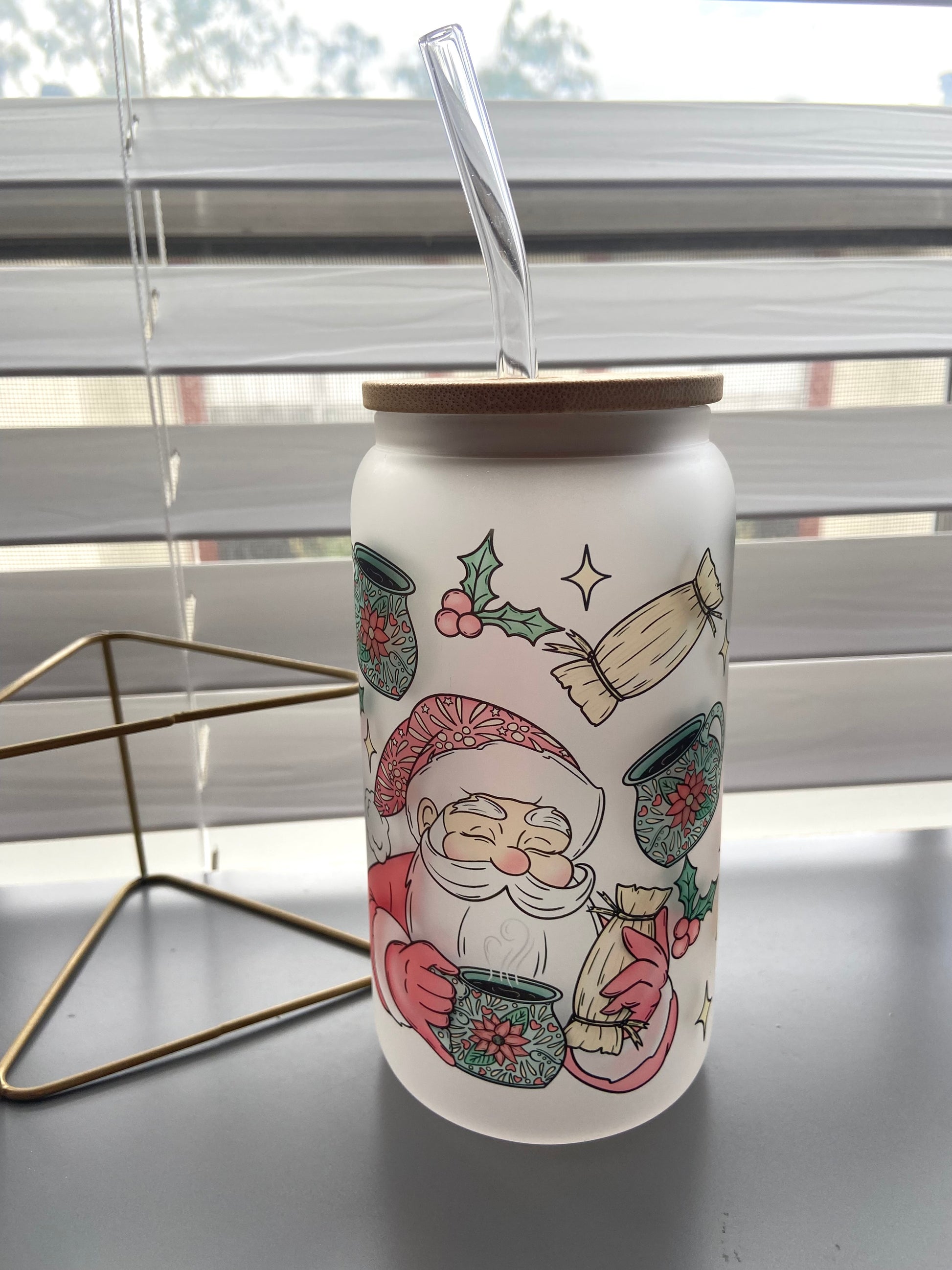 Indulge in the charming vintage aesthetic of our Santa y tamales glass cup, adorned with a festive Santa and tamale print. Complete with a bamboo lid and straw, this cup is both stylish and practical.